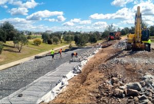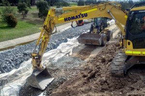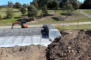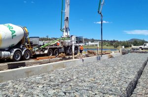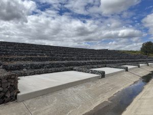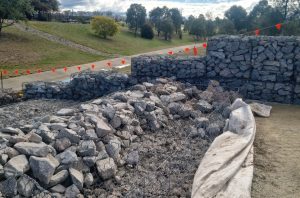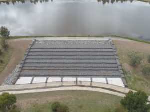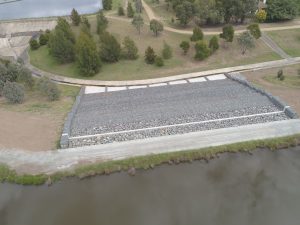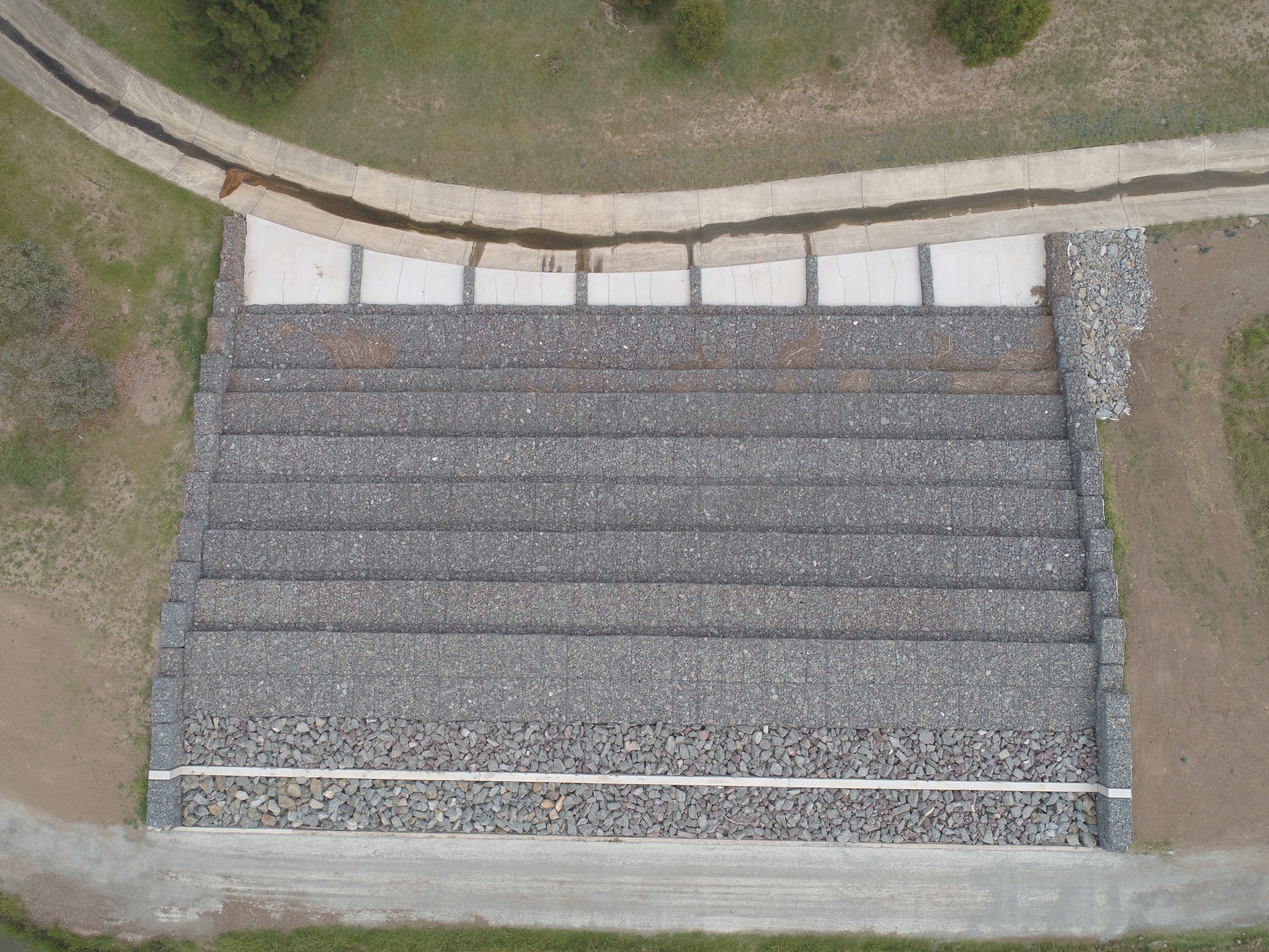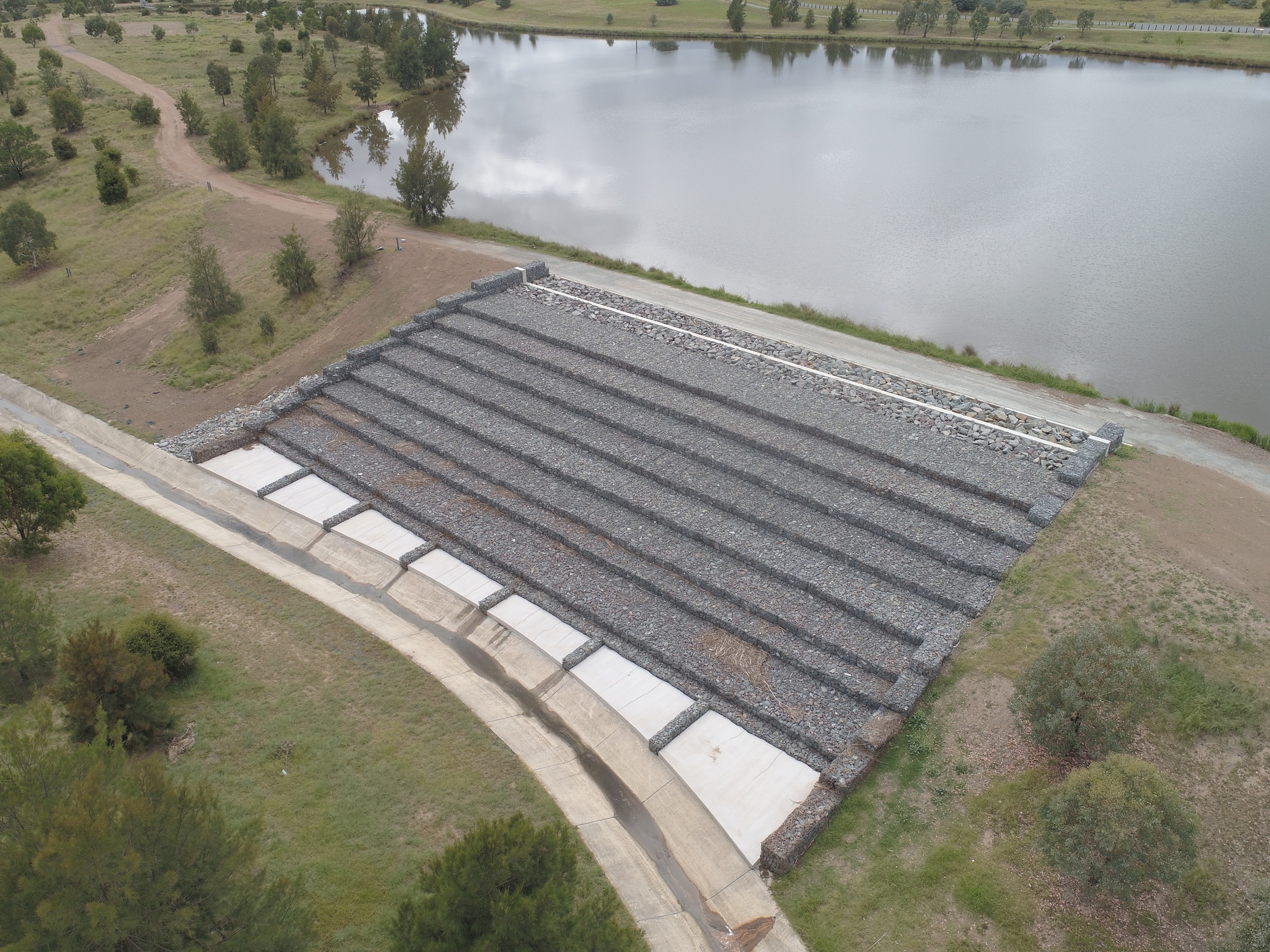 The project involved stripping and stockpiling existing rip rap, removing and disposing of geofabric, and reprofiling the dam embankment via excavation, filling, and compaction. Foundation preparation and installation of new geofabric preceded the staged construction of gabion baskets and reno mattresses, filled with both recovered and imported rockfill. Oversized materials were strategically placed, followed by concrete works for the new sill beam.